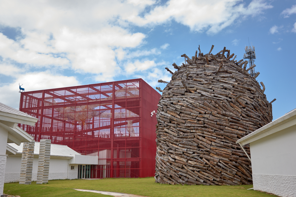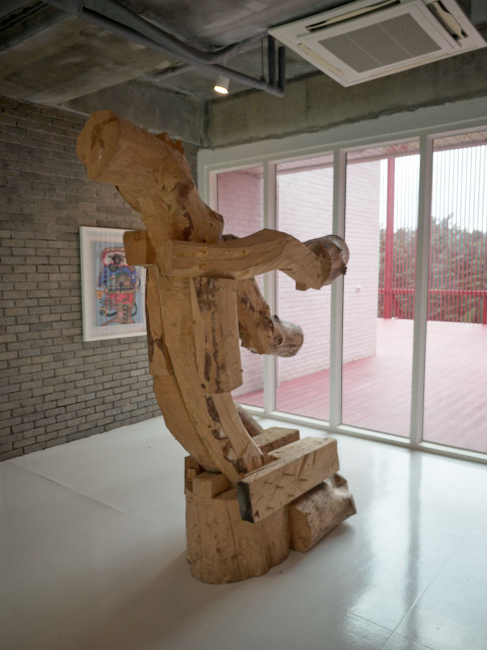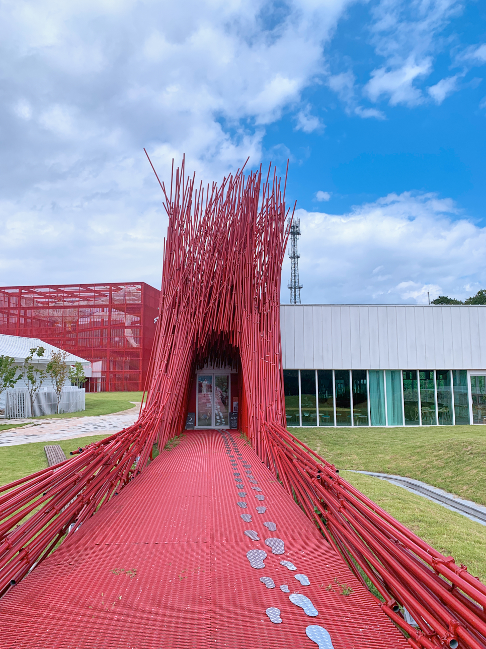 미술관은 독립된 건물과 파이프로 만든 파빌리온, 그리고 그사이의 길로 만들어져 있다. 하얀색 건물 사이 강렬한 붉은 색을 보다 이 녹색 길을 쉬엄쉬엄 거닐며 미술관을 넓은 눈으로 바라보는 시간을 가지게 된다. 하늘로 올라가려는 이무기도 보이고, 무리에서 뛰쳐나온 푸른 사슴 한 마리도 볼 수 있다. 저기 나무로 만든 곳은 아마 목성임에 틀림없다.