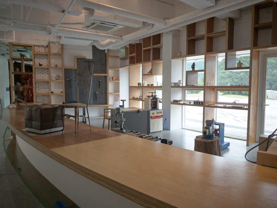 카페는 최옥영 작가가 여러 나라에서 수집한 가구와 설치미술작품을 이용해서 멋진 공간을 만드셨다. 각종 체험행사장으로도 사용하고 기념품 판매도 함께하는 공간이다.