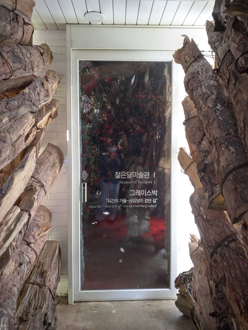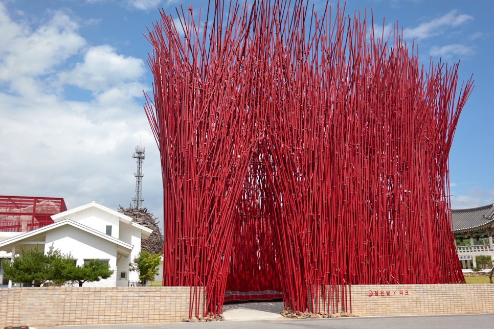 강원도 영월군 주천면에 있는 펜션을 몇 차례 이용하기 위해서 오가면서 높고 빨간 구조물이 눈에 들어왔다. 새빨간 장대가 높이 솟아있어서 나의 궁금증을 자아내기에 충분했다. 검색해 보니 미술관임을 알았다. 이름은 ‘젊은달 와이파크’. 첫 방문은 어떻게 생긴 곳인지 궁금해서 방문했었다. 궁금증을 자아내던 새빨간 장대는 대나무를 표현한 미술관장의 작품이라는 것을 알았다. 그냥 미술관이 아님을 알았다. 장대를 통과해서 기념품 판매와 카페를 함께 운영하는 안내소로 갔고, 대략의 정보를 얻고 다시 돌아왔다. 아마 입장료와 관람 시간 때문이었던 것 같다.