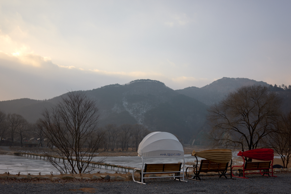 오전 9시 즈음 섶다리로 나섰다. 벤치에는 전에 못보던 지붕(?)이 생겼다. 평창강은 얼어있었다.