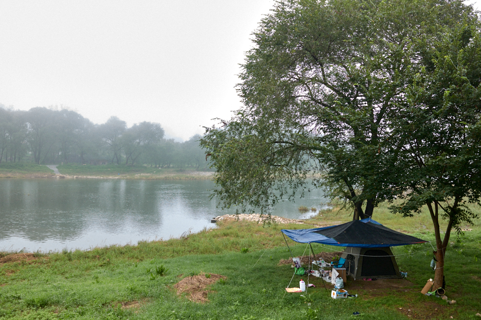 여름 한가운데, 그 곳에 다리는 없었다. 하지만 전에 보지 못했던 텐트가 보였다. 이후 방문할 때마다 텐트가 쳐 있었다. 다리 건너편 '섶다방'을 지나 깊숙히 들어가면 펜션과 큰 캠핑장이 있다. 늦여름이어서 인지, 나뭇잎은 녹색이 짙어졌다.